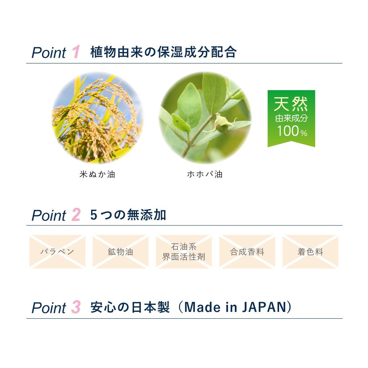 ・植物由来の保湿成分配合:米ぬか油、ホホバ油