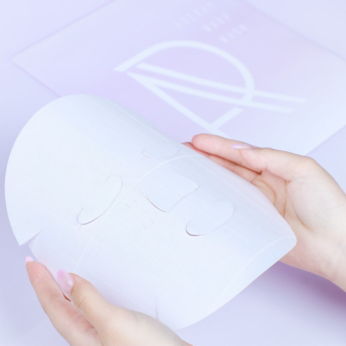 2.ピンク色のカバーを剝がしマスクを目の位置などにあわせて肌に密着させます。